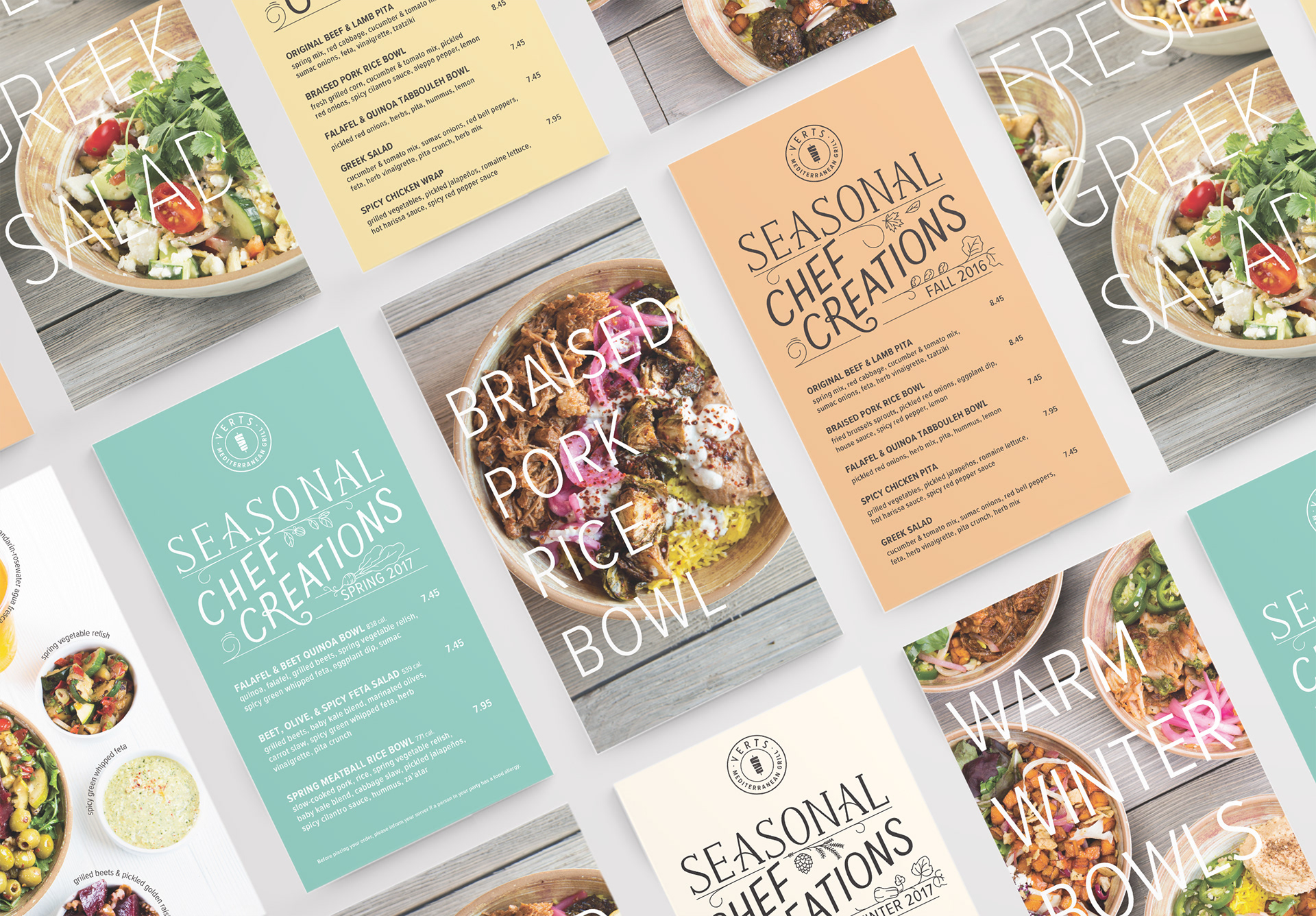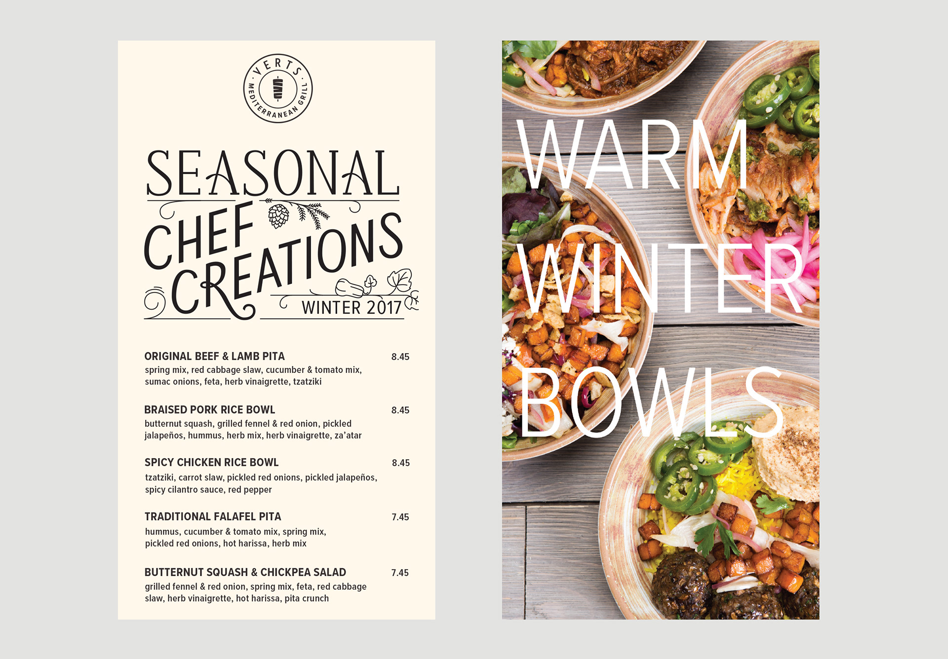 A suite of seasonal menu cards for Verts Mediterranean Grill. I introduced a unique seasonal menu graphic suite, cementing the idea of a changing menu to confused guests (and reducing quarterly printing costs.) These Seasonal Chef Creation Cards are the main component. Their colors correspond with the rest of the seasonal menu suite, making it easy to understand what is permanent and what is temporary. To push the idea of customization and curation, each menu was hand-lettered and illustrated just to add that bit of flair.
